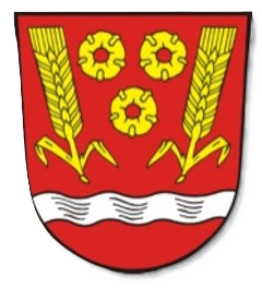 In Rot über gesenktem silbernem Wellenbalken zwischen zwei goldenen Ähren drei, zwei zu eins gestellte, goldene heraldische Rosen mit roten Butzen.