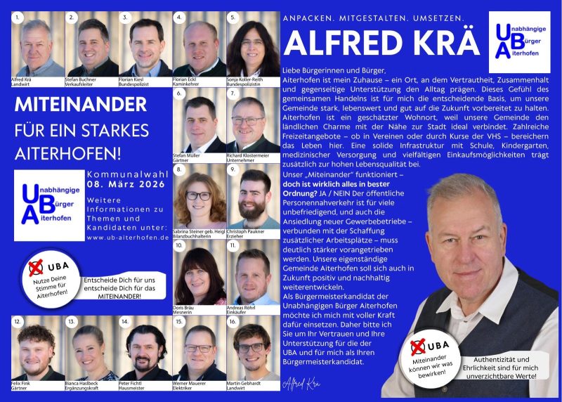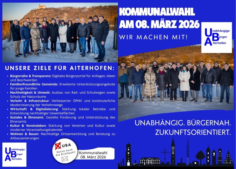Wir werden in allen Ortsteilen der Gemeinde Aiterhofen Informationsflyer an die Haushalte verteilen. Hier stellen wir unseren Flyer auch digital für Sie bereit. Neben Informationen über uns, Unabhängige Bürger Aiterhofen, der Vorstellung unseres Bürgermeisterkandidaten sowie allen 16 Gemeinderatsbewerbern mit den 2 Ersatzkandidaten, finden Sie auch Hinweise zum Wahlvorschlag.